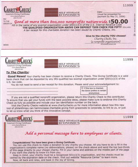 The middle section explains the Giving Certificate to the charity chosen by the recipient. That portion is completed by the recipient and sent to the charity along with the top third, which can be deposited like any check.