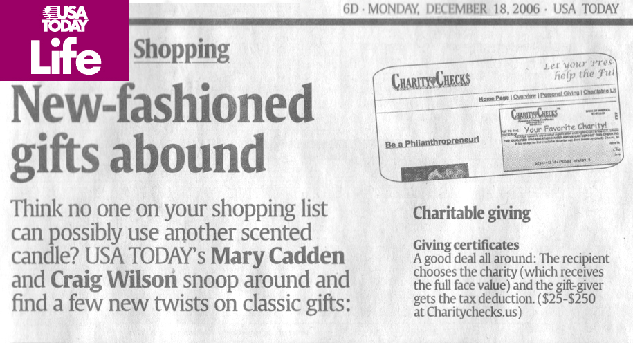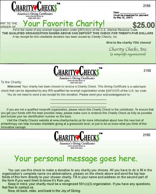 "Charity Checks," "Giving Certificates," "The Giving Package," "Give the Joy of Giving," and "Teach the Joy of Giving" are trademarks, and "Charitable Literacy" and "Philanthropreneur" are servicemarks, of Charity Checks, Inc., a not-for-profit corporation. © 2000-2013 Charity Checks, Inc. |